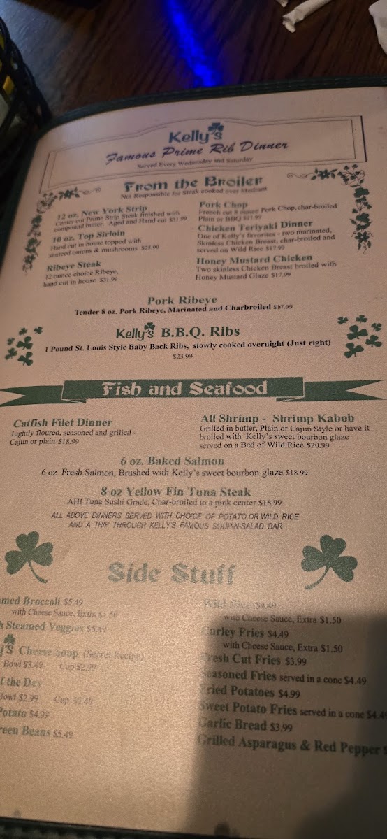 Among the culinary delights on offer, their burgers stand out. The Kelly's Burger at $12.49 is a fan favorite, while the Western Burger takes it up a notch at $12.99. For those craving something unique, the Mushroom Burger also makes for a delicious option. Moreover, sandwich lovers will revel in choices like the Prime Rib Sandwich and Kelly's Tenderloin, both priced affordably under $13. What's more, the restaurant features an impressive range of baskets, including delectable shrimp and rib options at $10.99.
